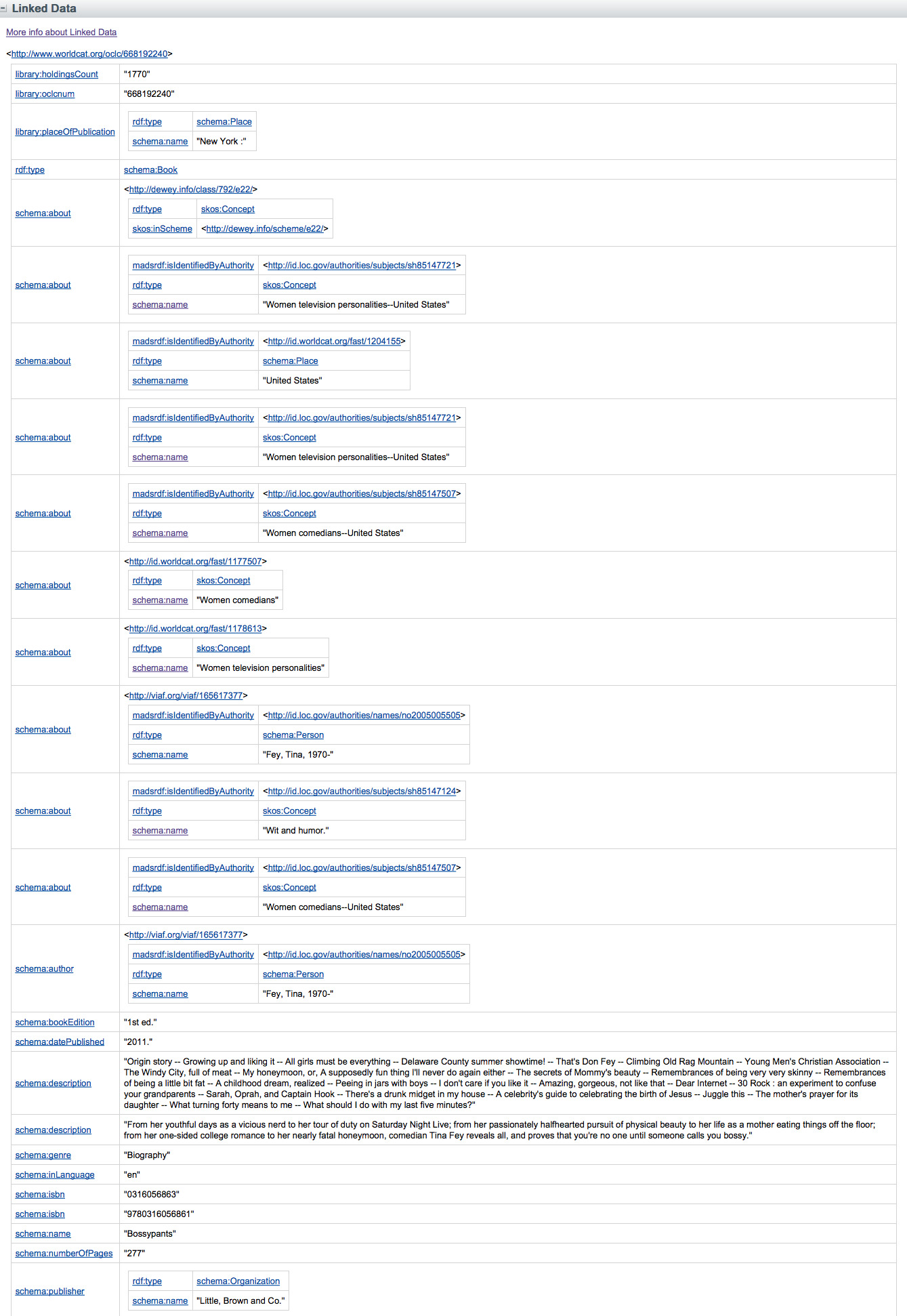 Example of Linked Data From WorldCat.org For Bossypants by Tina Fey (Click to Go to WorldCat Record)