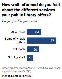 Echoing the findings of our 2012 survey, 23% of those who have ever used a public library said they feel like they know all or most of the service and programs their library offers, while a plurality (47%) said that they know some of what it offers. About one in five (20%) say they don’t know very much about what is offered, and 10% say they know “nothing at all.”