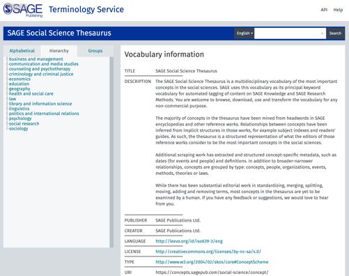 It launches with the SAGE Social Science Thesaurus, a multidisciplinary vocabulary of the most important concepts in the social sciences that combines concepts, relationships and definitions. Most of this vocabulary has been created by using semantic text mining to put structure around text content published by SAGE.