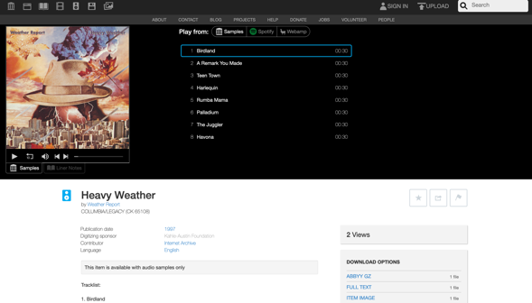 Highlighting the growing importance of music on archive.org is the debut this month of our new music player. While you can listen to only a sample of most modern songs, the new player now embeds Spotify and YouTube versions of the full song, so listeners are now able to click right from archive.org to those services and listen to the full track.