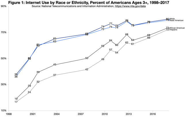 Although this is still less than the 80 percent of non-Hispanic Whites online in 2017, the gap has begun to narrow. Internet usage rates for Hispanics are now similar to African Americans, who have also experienced gains in Internet use in recent years.
