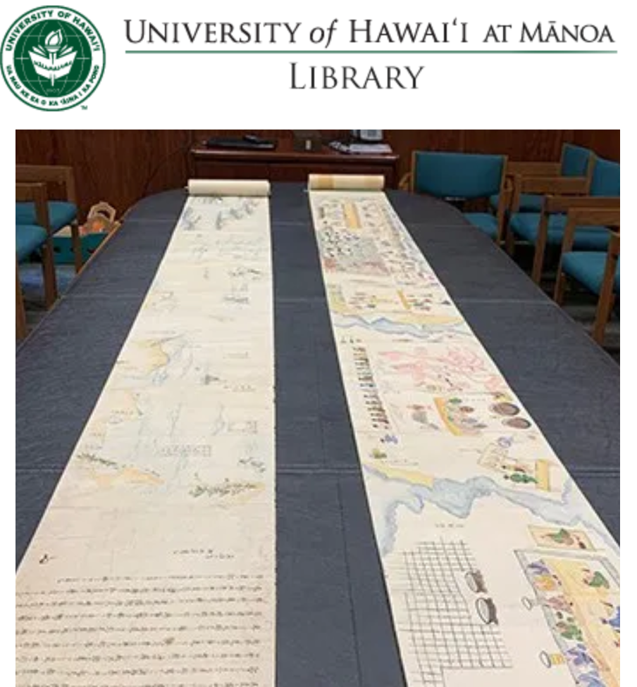 The University of Hawaiʻi at Mānoa Hamilton Library received two rare Japanese scrolls from Deborah Rudolf, wife of the late John Harvard Hawley. The scrolls, entitled 鯨魚覧笑録 (Geigyoran shoroku), were created in 1819 and depict the entire process of whalehunting during Japan’s Edo period (1600–1868). The scrolls are hand-painted and over 400 inches long. Scrolls with the same title, but less colorful, are housed in the Tokyo National Museum.