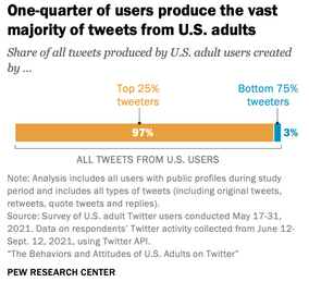 The analysis also reveals another familiar pattern on social media: that a relatively small share of highly active users produce the vast majority of content. An analysis of tweets by this representative sample of U.S. adult Twitter users from June 12 to Sept. 12, 2021, finds that the most active 25% of U.S. adults on Twitter by tweet volume produced 97% of all tweets from these users.