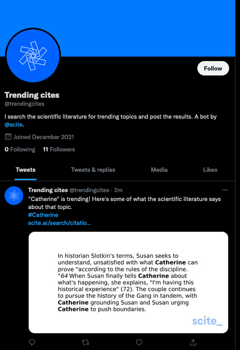 At scite, we work with another amazing source of information, research publications. What if these worlds were combined? With the launch of a new Twitter bot @trendingcites, that’s exactly what we aim to do.
