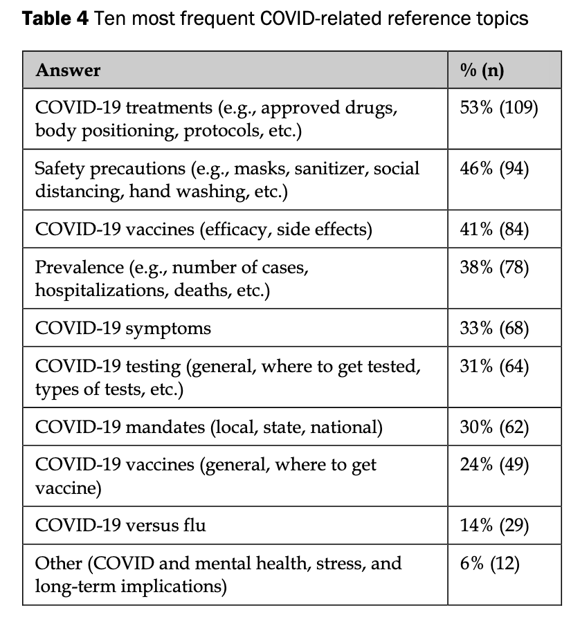 Conclusions: The results of the survey characterize the evolving nature and scope of academic health sciences reference work during the COVID-19 pandemic. Librarians reported an increase in reference questions during the pandemic and are answering them in creative ways despite barriers (e.g., limited time and reduction in resources). There is an opportunity for librarians to continue to address COVID-related misinformation. Overall, these findings provide useful insight for library practitioners and administrators planning reference services during public health crises.