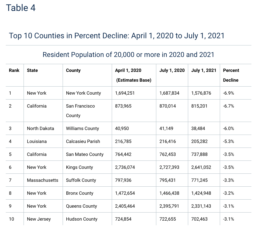 - Los Angeles County, California experienced the largest population loss of any county, losing 159,621 residents in 2021.