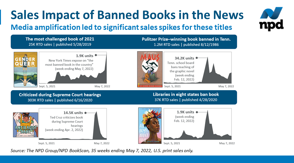 The number of books banned last year in various states in the U.S. reached the highest levels in the history of tracking by The American Library Association. In the public square, the surge in bans and community challenges against specific titles, like “Maus,” “Antiracist Baby,” and “Gender Queer” have been covered widely by the media. According to The NPD Group, these types of challenges, and the media attention surrounding them, led to significant sales increases for these books.
