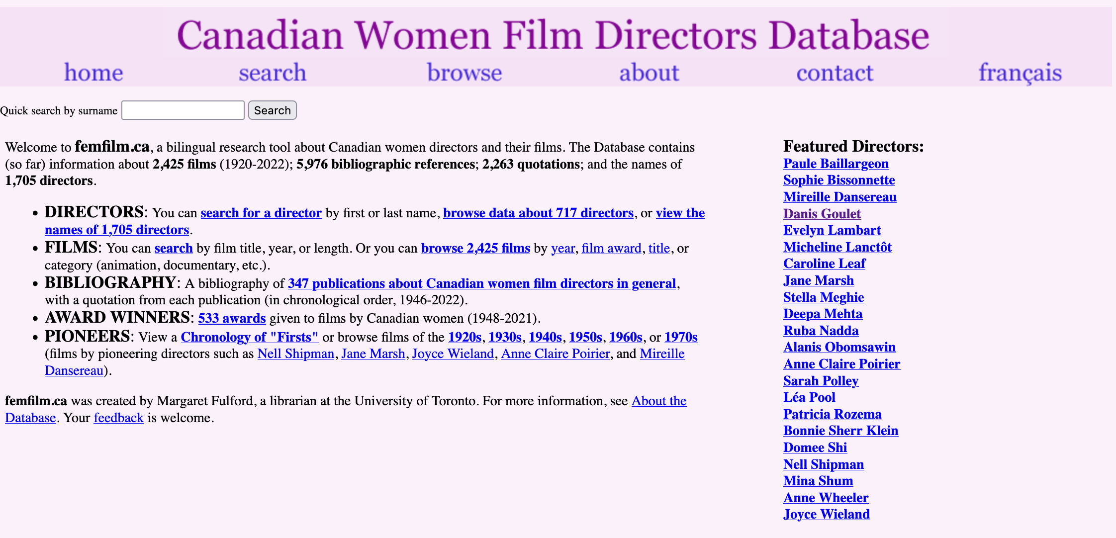 A lifelong film buff and feminist, Fulford was inspired to create such a resource after attending a 1980s festival showcasing women’s films. Much later, she decided to devote her first year-long research leave to create a database of Canadian women filmmakers.