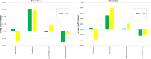 Fig 5. Average weighted z-score for green and gold OA publications (left) and references to green and gold OA publications (right) by income category. Source: 10.1371/journal.pone.0272730.g005
