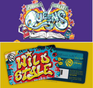 The new library cards feature a purple background with a graffiti art-style design that reads “Queens,” as well as an open book, two street signs that say “Public” and “Library” and two smiley-faced spray paint cans. The overall design is the artistic vision of Shirt Kings streetwear.