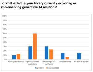 The first poll,which ran in April 2023, provided an initial snapshot of the AI landscape in libraries. The second poll, carried out in December 2023, continued this inquiry, offering a comparative perspective on the evolving dynamics of AI use and possibilities in library services. This study analyzes and juxtaposes the outcomes of these two surveys to better understand how library leaders are managing the complexities of integrating AI into their operations and services. It specifically seeks to capture changing perspectives on the potential impact of AI, assess the extent of AI exploration and implementation within libraries, and identify AI applications relevant to the current library environment.