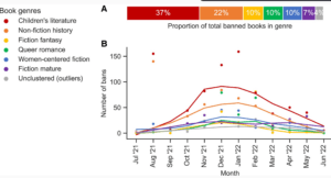 Children’s books featuring diverse characters are most likely to be banned. A) Proportion of banned books clustered into each genre. Books (N = 1,370) can only be clustered into one genre, so genres sum to 100%. B) Number of bans per genre over time. Number of bans (N = 2,532; books can be banned multiple times) per genre each month over the 2021–2022 school year, smoothed with loess. Source: 10.1093/pnasnexus/pgae197