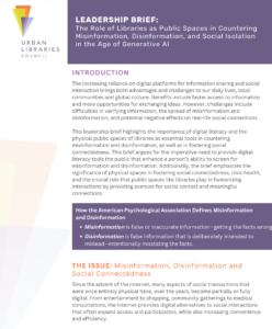The Urban Libraries Council released a new Leadership Brief addressing the rise of generative artificial intelligence (AI) and its contribution to the spread of misinformation and disinformation. With social isolation on the rise, this brief examines how public libraries are uniquely positioned to combat these issues through the promotion of digital literacy and the cultivation of community connections.