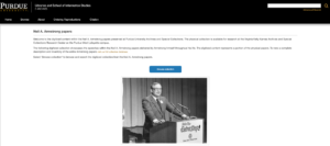 The Neil Armstrong papers continue to be one of the most accessed collections for research requests and instructional usage through ASC. Increasing ease of access to the archival collection through digitization has been a goal since the acquisition of the speeches in 2011. Work to digitize the speeches, funded by the Purdue Research Foundation and Carol Armstrong, began in 2022. The digitization process itself is lengthy and requires that each speech be described, vetted for third-party copyright, and uploaded to e-Archives.