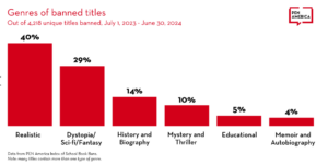 Of the 4,218 unique banned titles in the 2023-2024 school year, 1,534 or 36% featured fictional characters or real people of color. In analyzing banned history and biography titles alone, PEN America found 44% featured people of color, with 26% of banned historical and biographical titles specifically featuring Black people. The comprehensive analysis is based on PEN America’s doumentation of the more than 10,000 instances of book bans nationwide, as school districts banned many of the same titles. The movement to ban books originated in a coordinated network of groups that also largely espouses white supremacist and Christian nationalist ideology.