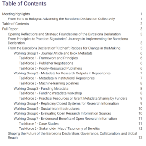 captures key outcomes from the event held on May 28, 2025, in the context of the 5th Workshop on Open Citations and Open Scholarly Metadata (WOOC2025). It highlights progress, priorities, and next steps across the Barcelona Declaration’s working groups.