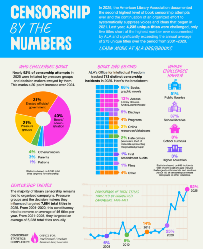 ALA’s Office for Intellectual Freedom (OIF) tracked 4,235 unique titles challenged in 2025, the second highest ever documented by ALA. The highest ever documented was 4,240 in 2023.