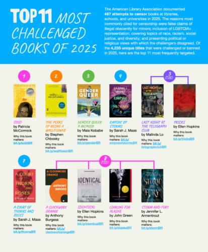 ALA documented 713 attempts to censor library materials and services, 487 of which targeted books. The Top 11 Most Targeted Titles in 2025 were:
