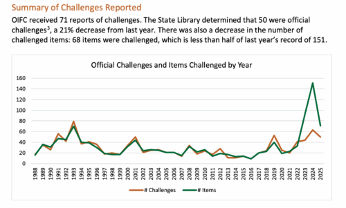 From the State Library of Oregon: The 2025 OIFC Annual Report lists 50 official challenge incidents in public libraries, special libraries, and schools. The number of challenges is tied with 2001 as the fifth highest reported since the State Library began keeping track. The incidents included challenges to 66 unique titles and 68 items, the fourth highest […]